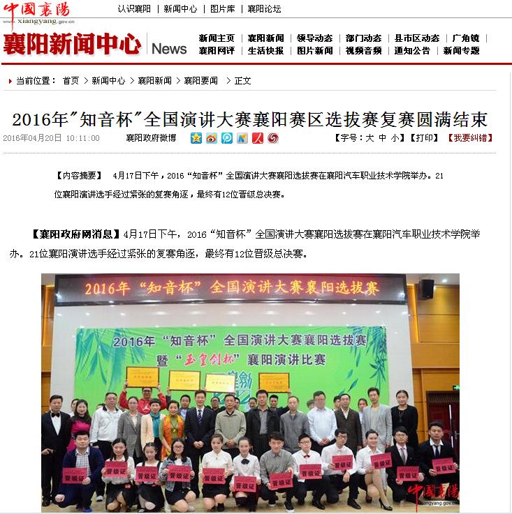 (通讯员:王航)4月17日下午,由襄阳政府网主办,襄阳汽车职业技术学院承办的2016年“知音杯”全国演讲大赛襄阳选拔赛圆满落下帷幕。比赛开始,由我院副院长程传红致主持词,对现场的各位评委嘉宾选手们表示了热烈的欢迎和祝贺。学工处处长付克强、团委书记谢迎辉出席本次比赛。