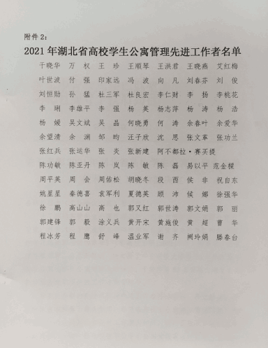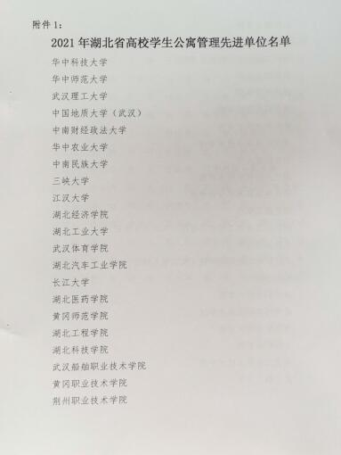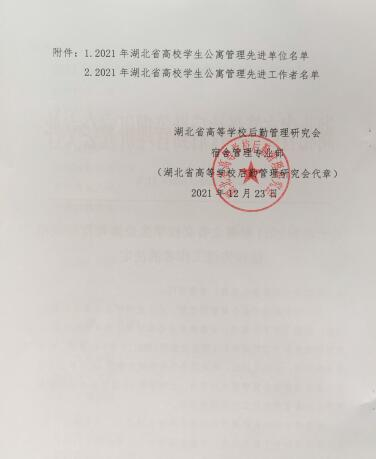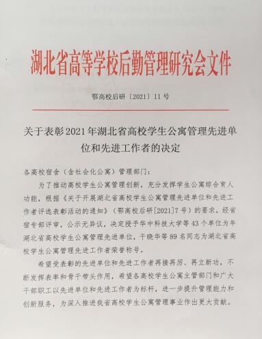 近日,从湖北省高校后勤管理研究会传来喜讯,我校荣获“2021年湖北省高校学生公寓管理先进单位”荣誉称号,学生工作处何晓勇同志荣获“2021年湖北省高校学生公寓管理先进工作者”荣誉称号。