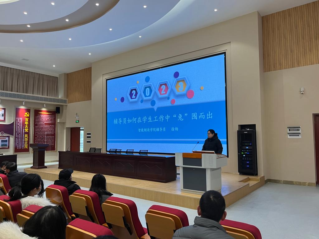 会上智能制造学院辅导员徐杨老师作了以“辅导员如何在学生工作中‘兔’围而出”为主题的交流培训。