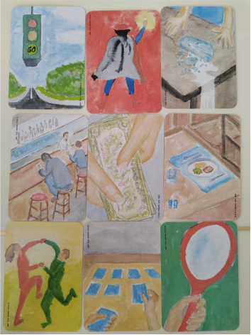 周老师首先带领同学们进行热身活动:同学们抽取OH卡,根据卡片所画讲故事接龙,进行两轮后同学们相互之间已比较熟悉了。接着,同学们重新抽取卡片,根据卡片图画,联系自己的现实生活构建一个属于自己的专属故事。在一个个构思巧妙、情节丰富的故事中,老师引导同学们探索自己内在的心理状态。