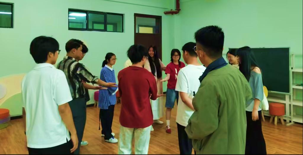 本次团辅由心理中心专职教师李琳带领。活动以“姓名接龙+模仿秀”拉开序幕。同学们围成的圆圈宛如跳动的音符,有人双手抬起模仿小狗等待食物,有人摇晃双臂演绎走路的企鹅,此起彼伏的"叽叽叽""哞哞哞"等动物交响乐让现场欢笑不断。热身活动结束后,某同学分享:“本以为模仿动物会很尴尬,但当整个团队都跟着我一起做时,突然觉得特别温暖。”同学们在模仿与被模仿中,大家的拘谨逐渐消散,欢声笑语充满整个房间,身上也释放出更多活力与热情。